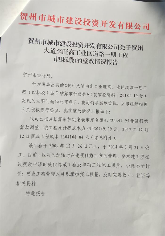 關于賀州大道至旺高工業區道路一期工程(四標段)的整改情況報告