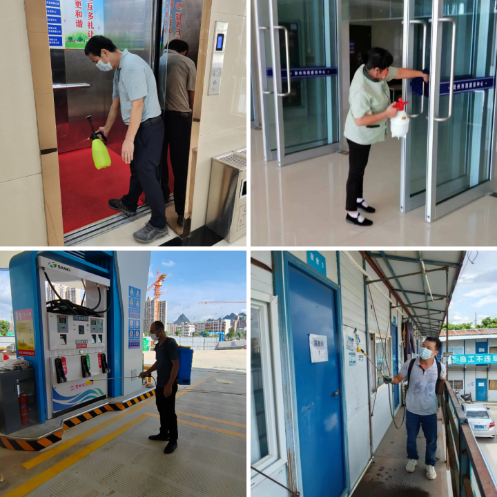 消殺人員全面對集團辦公區域樓道、會議室、衛生間等部位進行環境消殺,對辦公室門把窗鎖、電腦鍵盤鼠標、座椅扶手等頻繁接觸部位進行清潔消毒;對物管小區大門、單元入戶門、小區綠化帶、樓梯通道、電梯轎廂、樓梯扶手、垃圾桶、信報箱等各公共區域進行全面擦洗消毒,及時清運小區垃圾,清理衛生死角;對平安立體停車庫、平安加油站、姑婆山小鎮路花新村項目、城東污水處理廠項目等開展防控消殺。僅一天時間,城投集團共消殺辦公場所處,項目工地個,物管小區個,進行了“無死角、無盲區、全覆蓋”的地毯式消毒作業。