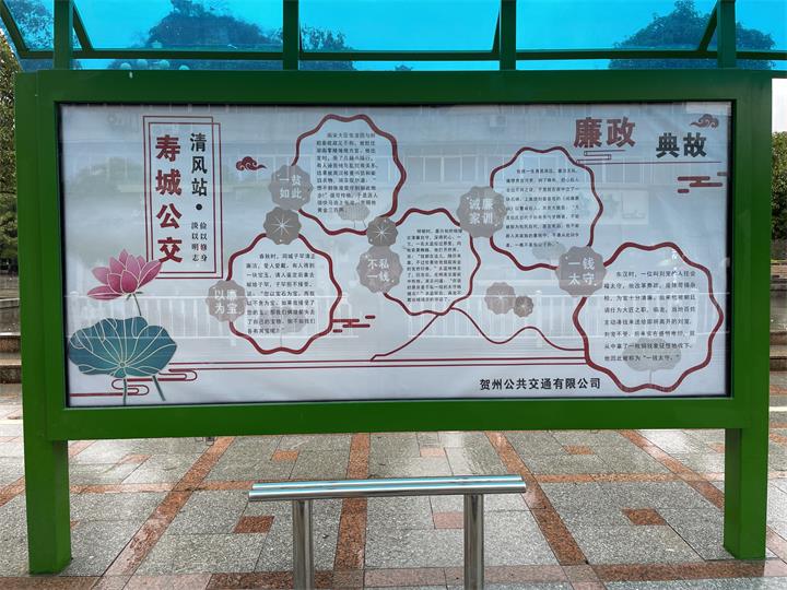 二是建設(shè)“壽城公交清風(fēng)站”。選取靈峰廣場、賀州市教育局公交站臺,將廉政典故、家庭家教家風(fēng)建設(shè)、創(chuàng)建文明城市等內(nèi)容融入公交站臺宣傳版面,在潛移默化中使廉政文化在市民心中生根發(fā)芽,最大限度地發(fā)揮了文化潤廉的良好作用。